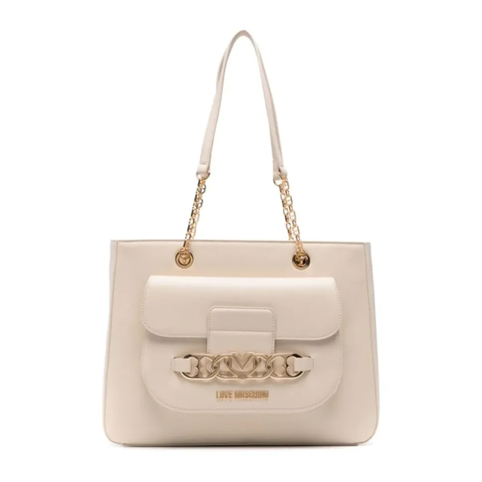 Borsa in ecopelle con scomparto centrale chiuso con zip. Passante a catena decorativa con cuori e logo LM. Logo Lettering in metallo. Tasca frontale chiusa con pattina.