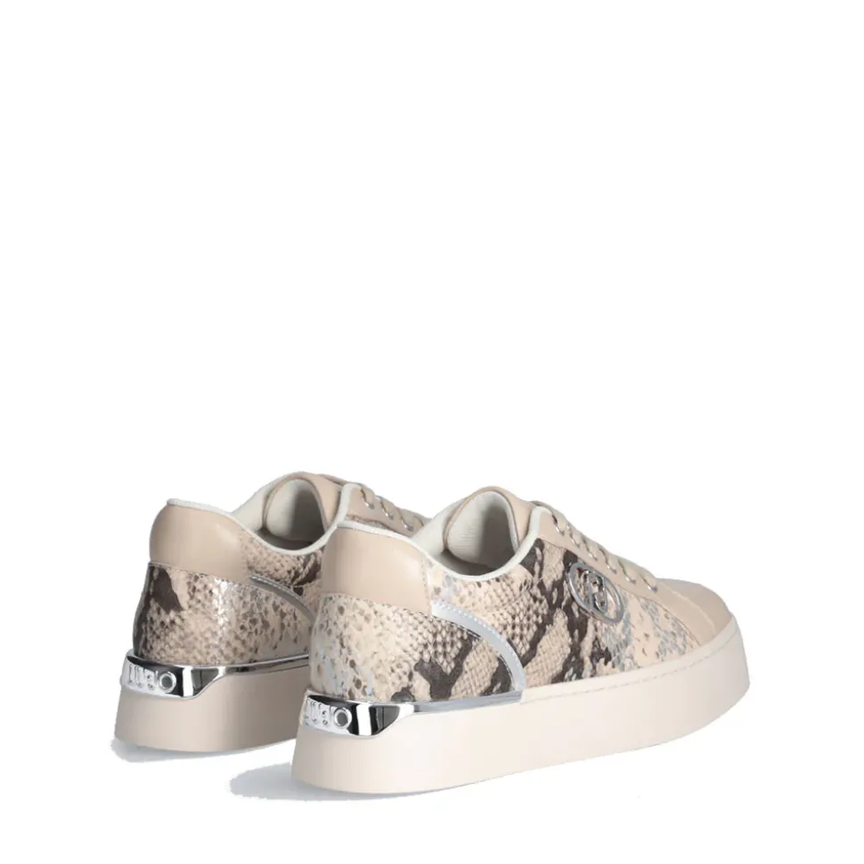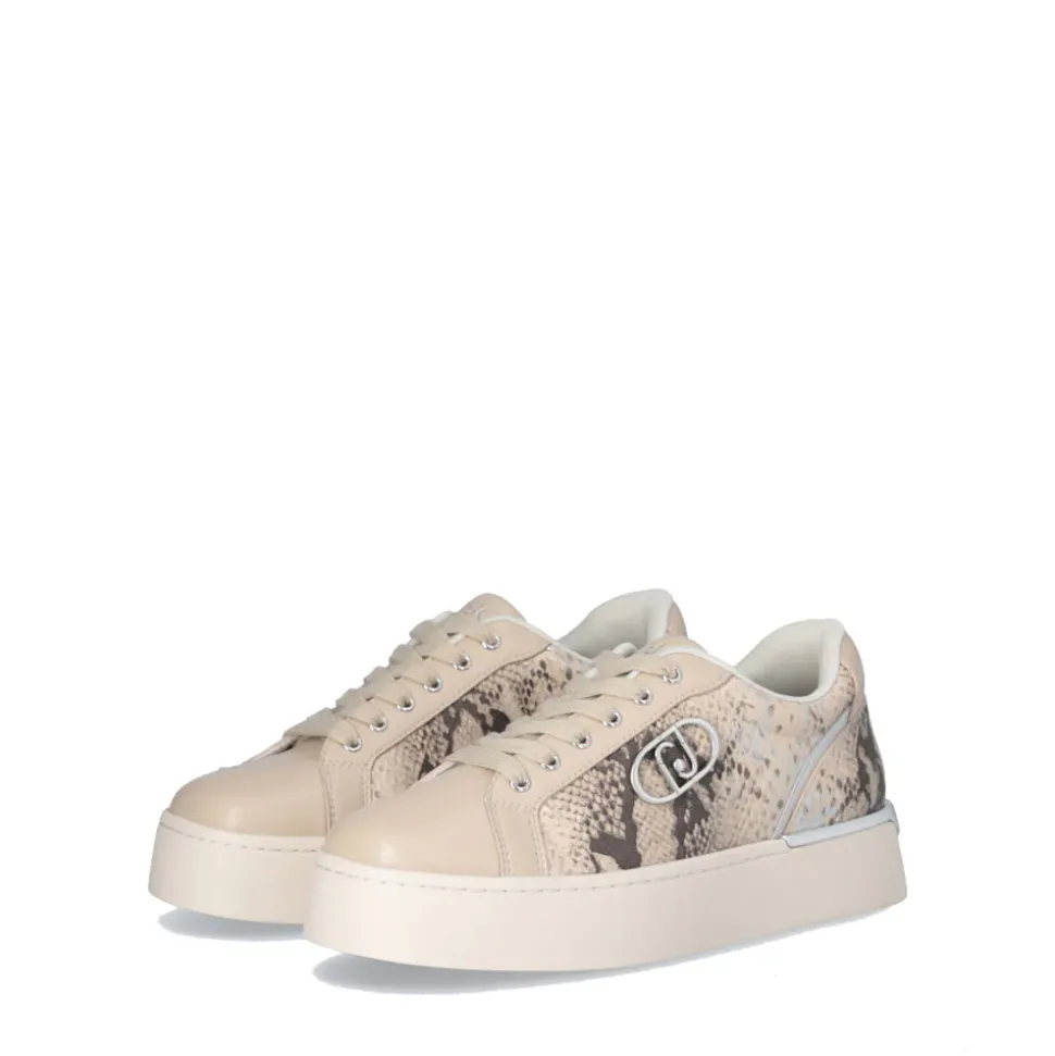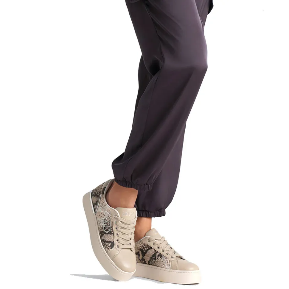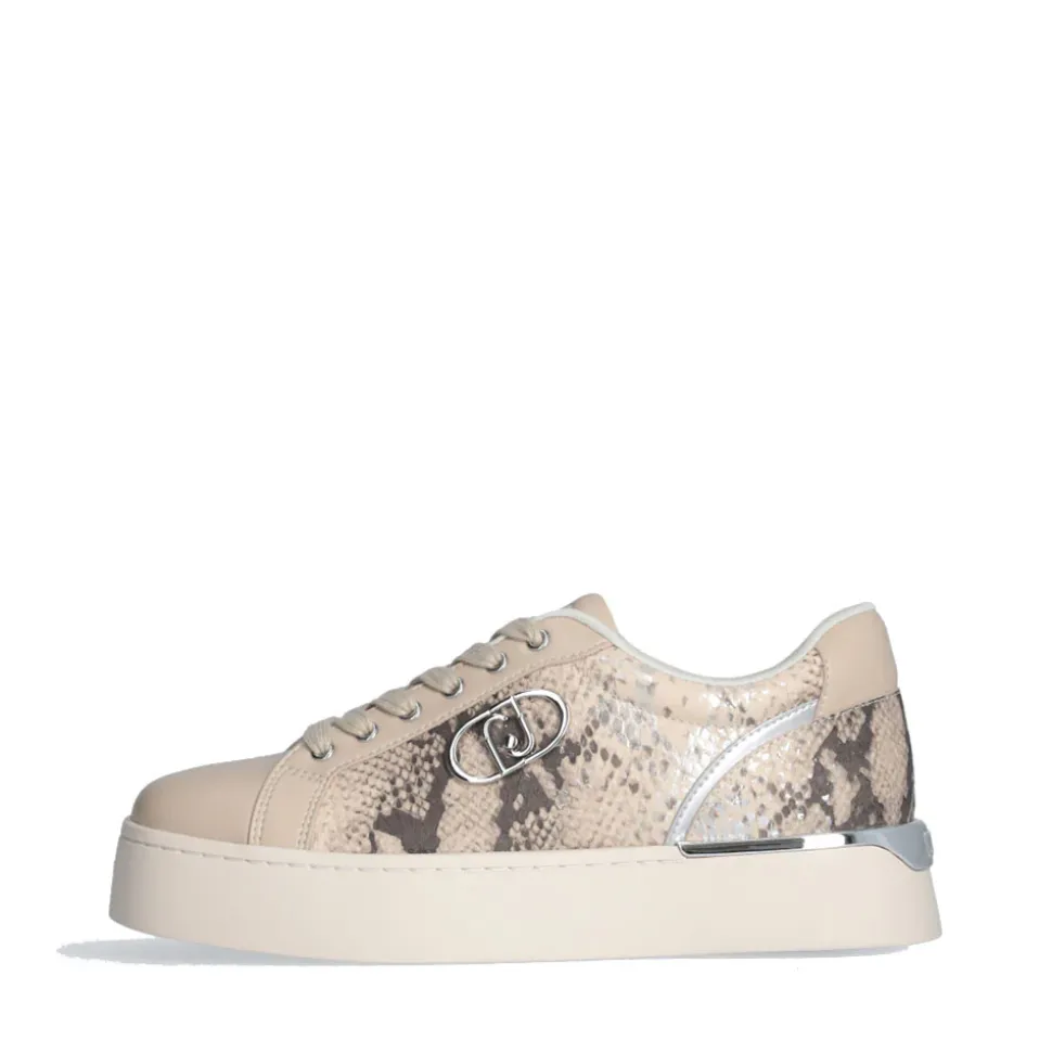 Sneakers beige con inserti stampa pitone. Logo LJ in metallo. Spoiler metallico con logo. Suola piatta in gomma.