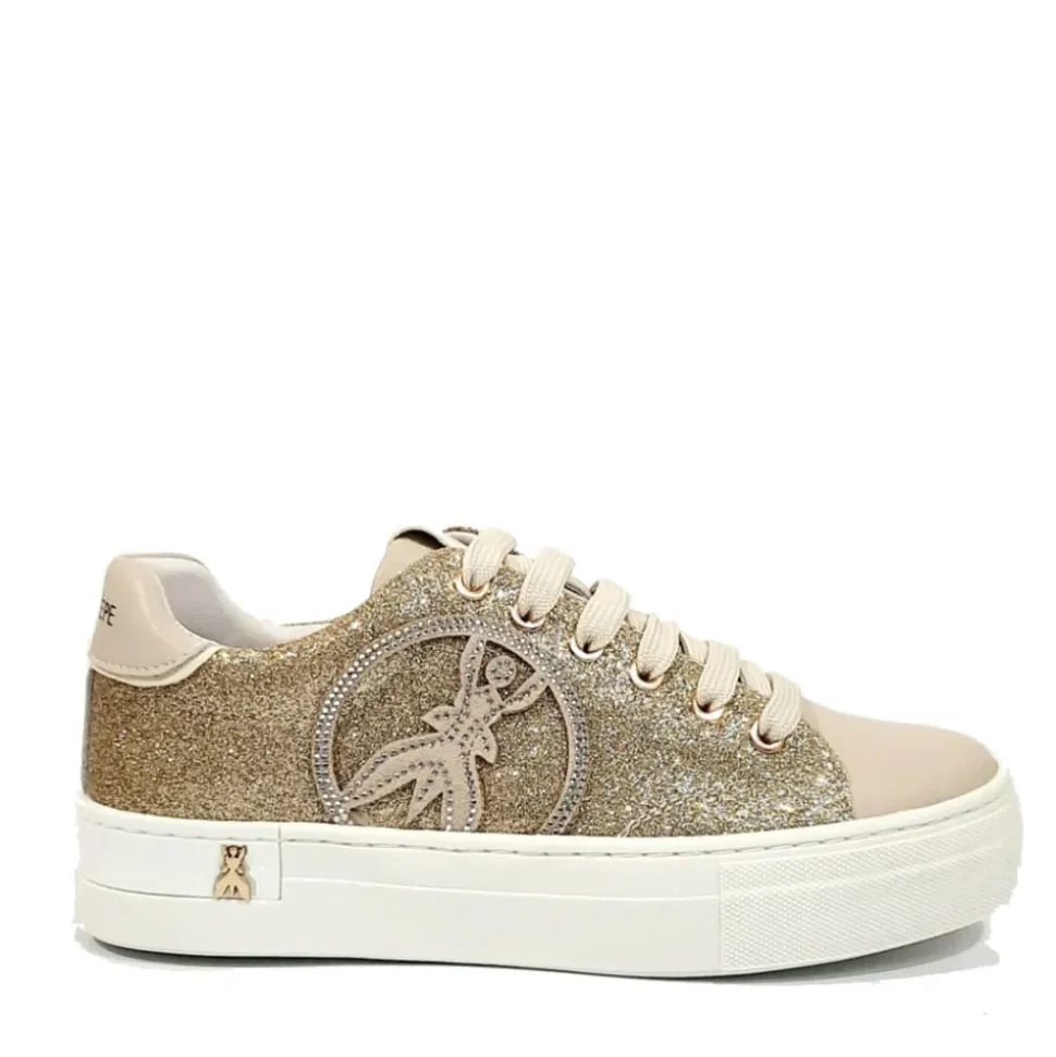 Sneakers con tomaia glitter all over e inserti in pelle beige. Logo Fly laterale. Suola platform in gomma.