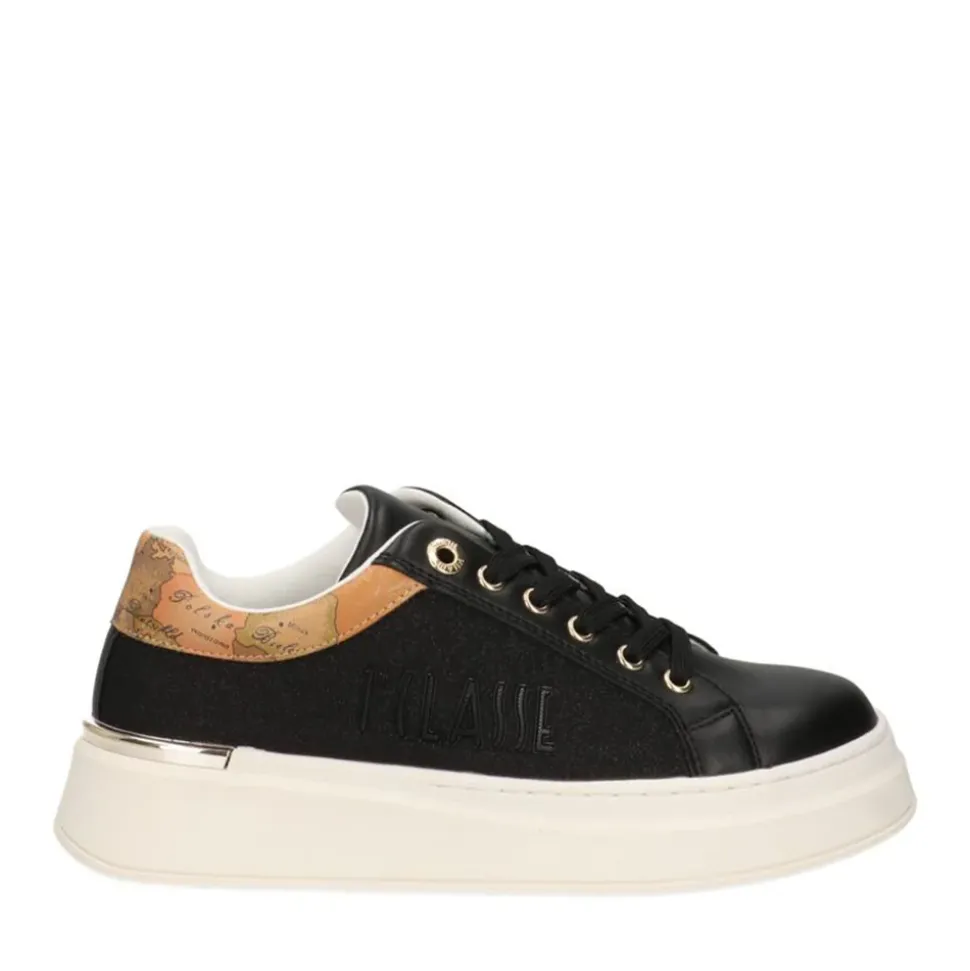 Sneakers in ecopelle nera con inserti laterali in lurex. Logo 1A Classe ton sur ton. Sono l’ideale per completare i look urban con un’impronta femminile e originale.