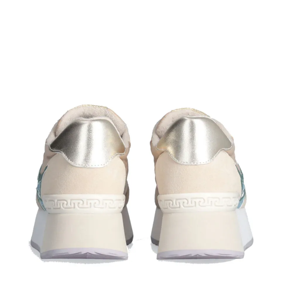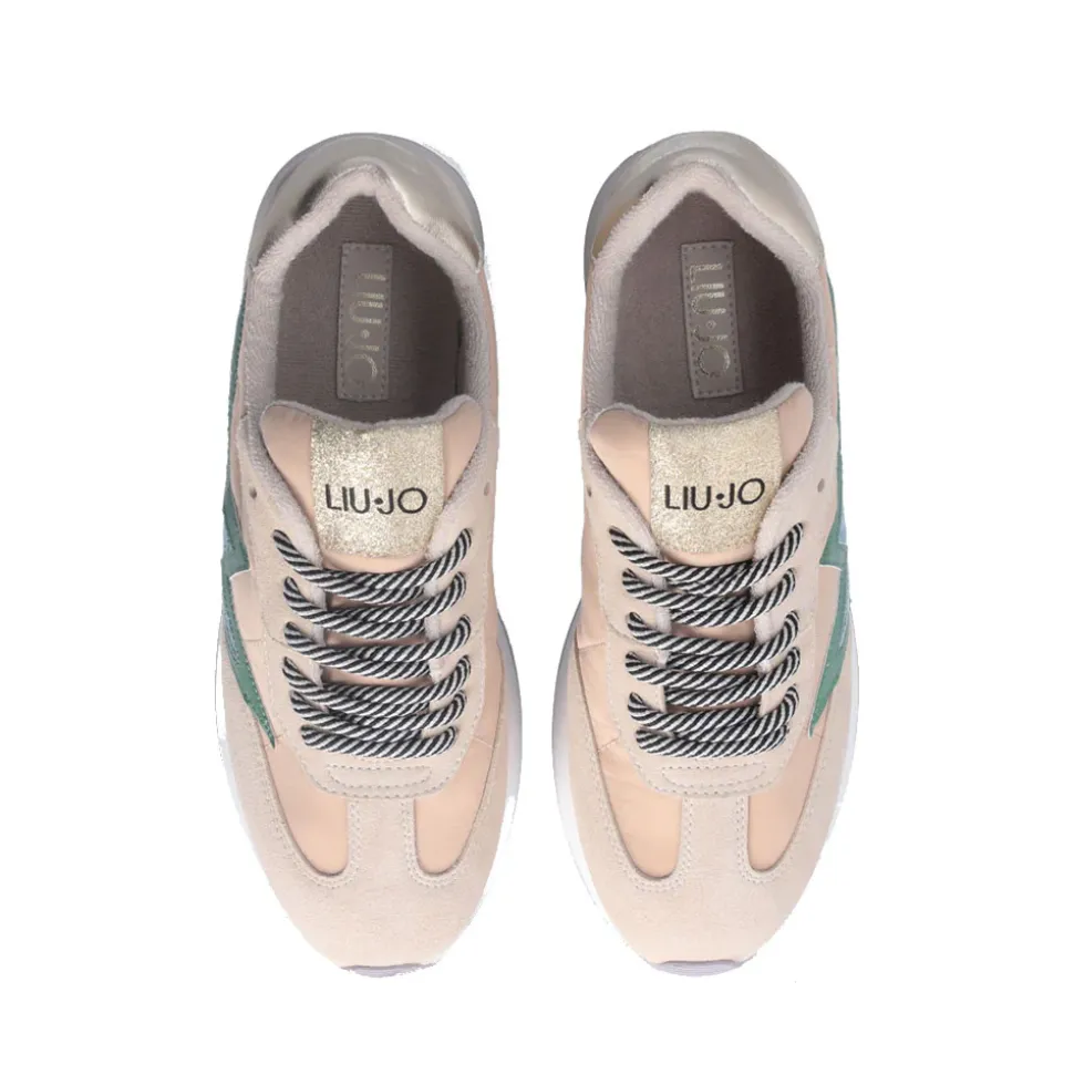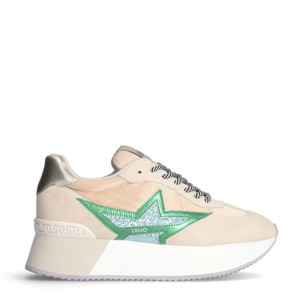 Sneakers in suede con interventi lamé e inserti in nylon. Maxi stella con glitter. Logo stampato. Lacci effetto torchon bicolor. Spoiler posteriore con dettaglio monogram LJ. Suola platform bicolor.