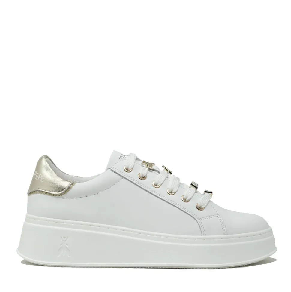Sneakers in pelle bianca. Dettaglio laminato sul tallone. Charms gioiello removibili. Suola platform in gomma.