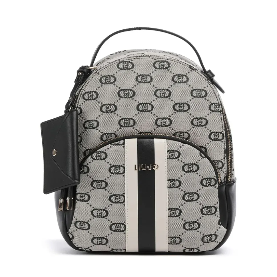 Zaino in tessuto jacquard con lettering LJ all over e inserti in ecopelle. Unico scomparto chiuso con zip. Spallacci regolabili con fibbia. Charm removibile.